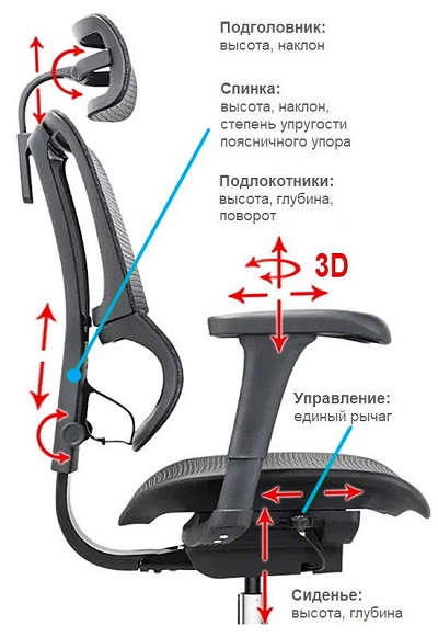- Подлокотники с настройкой по высоте, глубине и углу поворота