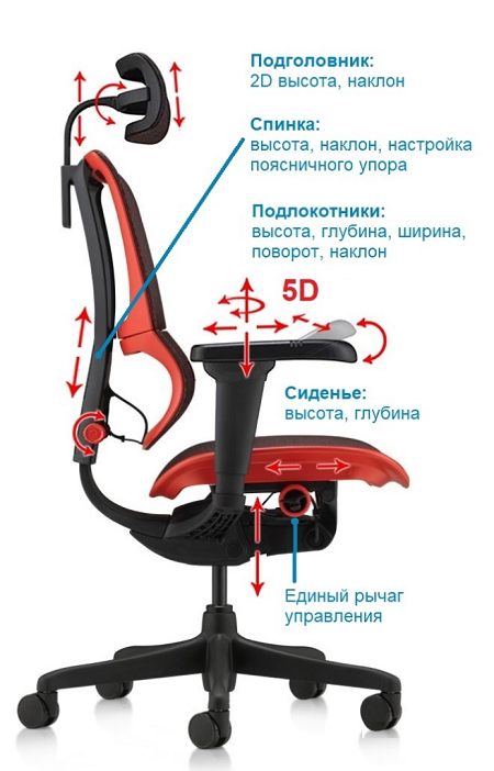 Уникальные 5D подлокотники обеспечивают удобное расположение рук при работе на компьютере и во время других занятий. Кроме обычных регулировок по высоте, ширине, глубине и углу поворота в горизонтальной плоскости подлокотники дополнены инновационной функцией сгибания передней части накладки. Верхняя площадка подлокотника разделена на две части, и передняя часть может сгибаться для поддержки предплечий при использовании мобильных устройств, игровых гаджетов или чтении книги.