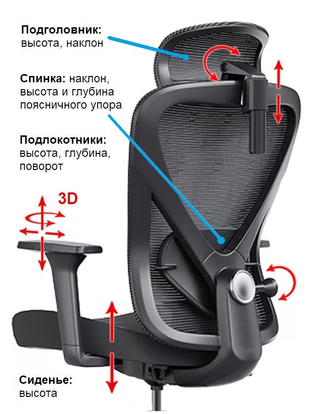 3D подлокотники с регулировкой по высоте, глубине и углу поворота способствуют уменьшению напряжения мышц плечевого пояса при работе с клавиатурой компьютера.